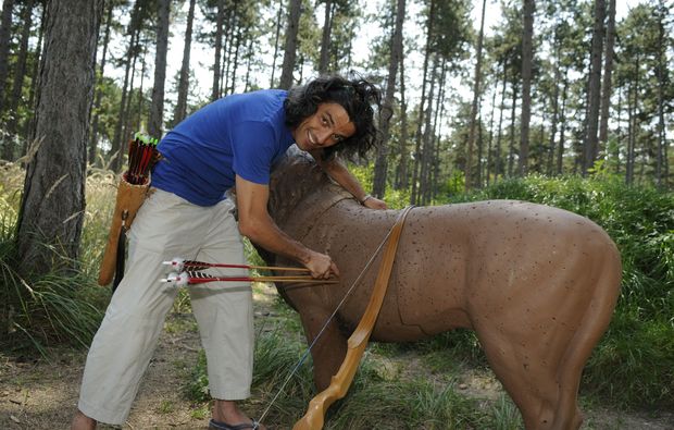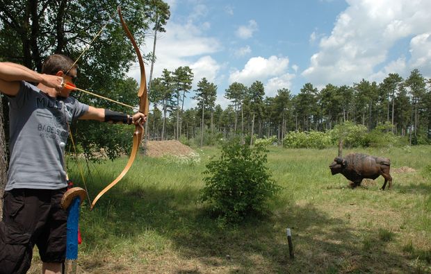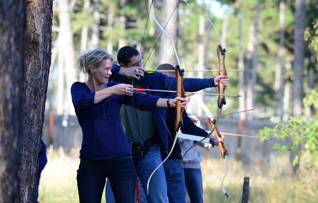 • Sicherheitsausrüstung und Einschulung im Bogenschieß-Parcours, Probepfeile unter sachkundiger Anleitung
