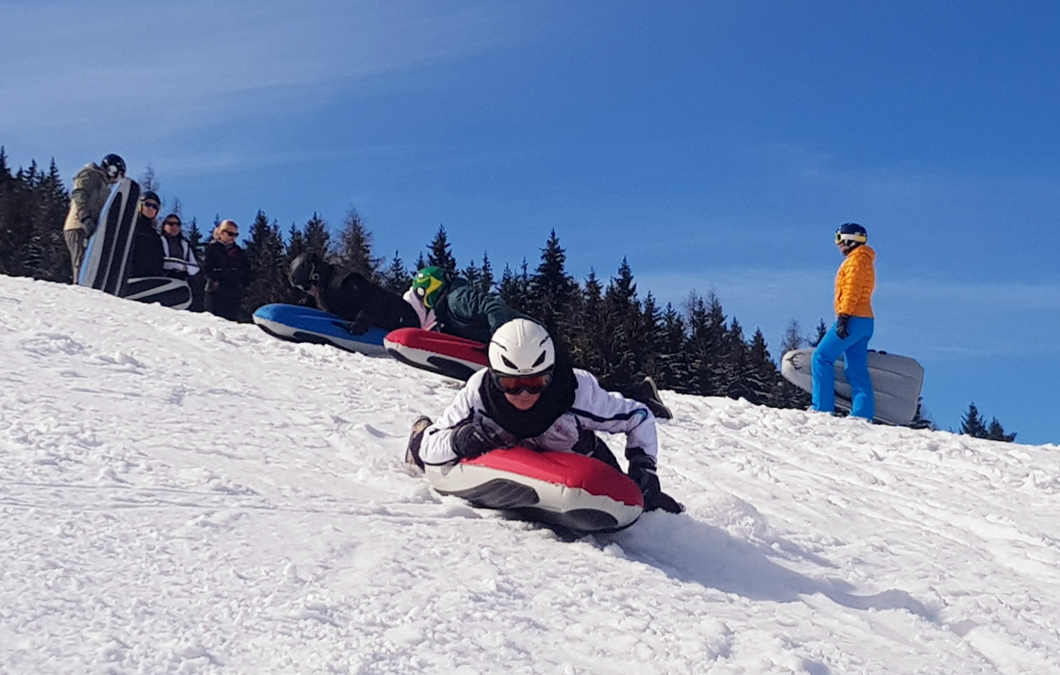 Nach einer Gondelfahrt nach oben genießt Du die winterliche Landschaft. Dann unternimmst Du erste Fahrversuche und lernst beim Airboarding Kurs in Schladming sicher zu bremsen und zu lenken. Mit professionellen Guides an Deiner Seite gleitest Du die Piste hinab und spürst dabei den kühlen Wind auf Deiner Haut. Dabei sind keine Vorkenntnisse nötig, um Deine Zeit im Winterwunderland zu genießen!