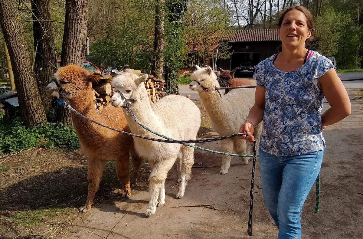 Sobald Eure Gruppe auf dem Bauernhof eingetroffen ist, kann der Spaß beginnen. Ihr werdet im Alpakastall eingewiesen und erfahrt Besonderheiten und Verhaltensweisen der ruhigen Tiere. Fragen sind herzlich willkommen. In der Kleingruppe ist genug Zeit, um auf alle Fragen individuell einzugehen. Sobald die liebevollen Alpakas gehalftert sind, schnappst Du Dir Deinen Partner und Ihr führt zu zweit das Alpaka. Dann werdet Ihr auch schon zum schönen Spazier-Gelände geführt.