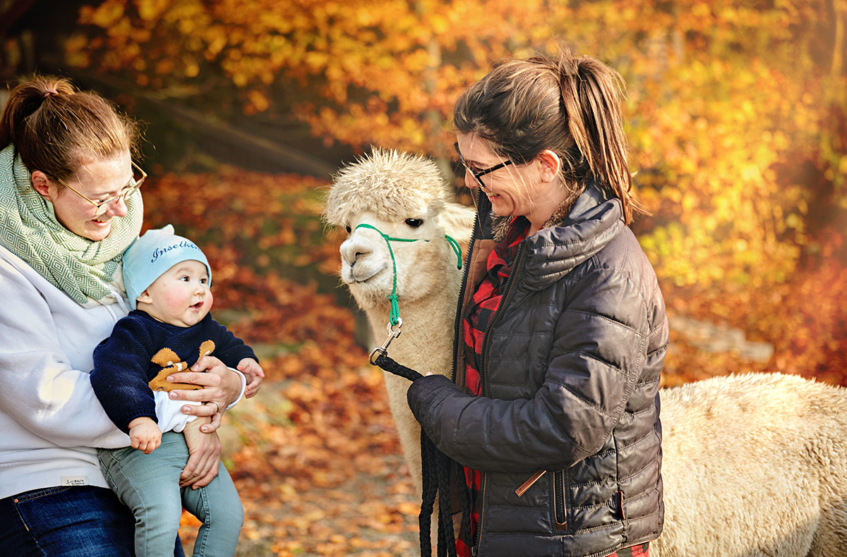 Gut gelaunt kommt Ihr auf dem Geflügelhof Der Hühnerbaron an. Die flauschigen Alpakas freuen sich schon riesig auf Euch. Zuerst beschnuppert Ihr Euch und schließt dann sofort Freundschaft. Die Alpakas bringen Eure Herzen direkt zum Schmelzen. Ihr bekommt eine kurze Einweisung, worauf Ihr beim Führen der süßen Tiere achten müsst und dann geht die Wanderung auch schon los.