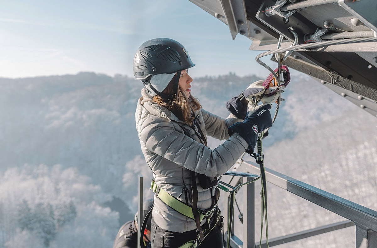 Sorgfältig gesichert beginnt jetzt Euer Aufstieg zu dem gigantischen Stahlbogen. Der weite Blick über das Tal breitet sich mit jedem Schritt aus – eine Mischung aus Adrenalin und Staunen. Ganz oben erwartet Euch der Höhepunkt: ein Schwebebalken für die extra Portion Nervenkitzel und eine Aussichtsplattform mit faszinierendem Panorama.