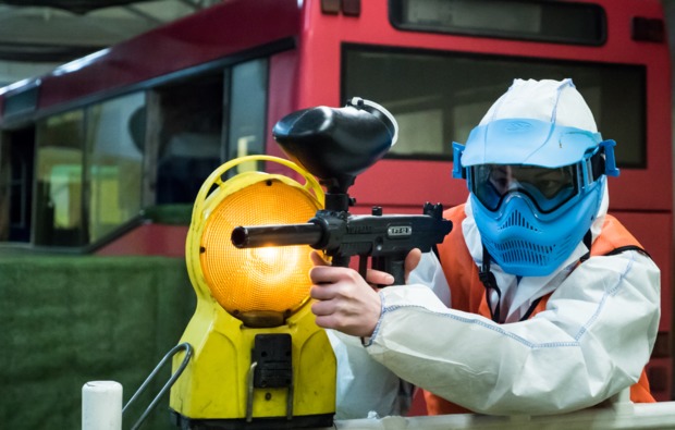 Dann mal nichts wie los: Beim Paintball spielen zwei Teams gegeneinander. Diese versuchen zwei Stunden lang, sich gegenseitig möglichst oft abzuschießen und dabei selbst wenig getroffen zu werden. Doch der farbenfrohe Spielspaß verlangt auch Taktik: Verstecke Dich auf dem Spielfeld hinter dem Kioskhäuschen, hinter dem Lkw oder im Bürokomplex. So findest Du ausreichend Deckung und kannst gezielt aus dem Hinterhalt angreifen. Das Besondere ist: Ihr bekommt für die gesamte Spieldauer Euer eigenes Spielfeld! Handle klug und werde mit Deiner Mannschaft so zum glücklichen Gewinner!