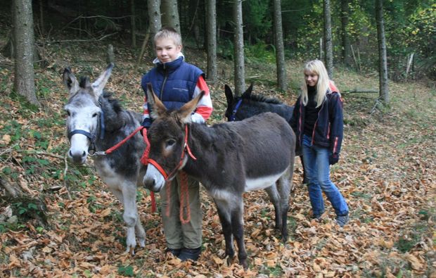 Mit einem sanften Ruck am Halfter startet die Trekking-Tour . Bei dem gemütlichen Tempo, das die Esel einschlagen, bleibt Dir auch genug Zeit, die wunderschöne Landschaft zu genießen. Lass Dich von Flora und Fauna begeistern, schmuse mit Deinem Esel auf dem Weg und genieße das Esel-Trekking in Kollnburg mit allen Sinnen. Führe den Esel geschickt über Stock und Stein und verwöhne ihn mit Zärtlichkeiten.