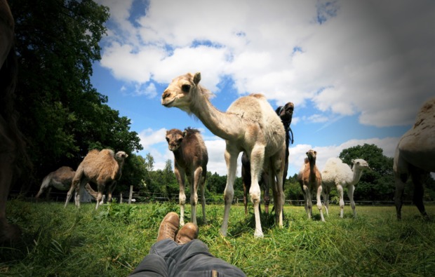 Habt Ihr den Dreh erst einmal raus, werdet Ihr sicher gar nicht mehr herunter wollen. Viele empfinden das sanfte Schaukeln sogar als eine Art besondere Massage, die den Rücken entlastet und auf diese Weise sogar den Wellnessfaktor beim Kamelreiten erhöht. Gemütlichen Schrittes geht es dann über die Koppeln und Wiesen. Dabei könnt ihr ganz entspannt die Schönheit der Umgebung betrachten und ungestört Naturgeräuschen lauschen. Denn da die Kamele keine Hufe haben, sondern lediglich weiche Sohlen, bewegen sie sich nahezu lautlos. Nur wenn man ganz genau hinhört, kann man ein leises Rascheln hören, wenn sie Ihren Gang über die Straßen und Felder fortsetzen. Und am Ende des Tages habt Ihr nicht nur einen wunderbar spannenden Ausritt auf dem Rücken der Kamele erlebt, sondern wahrscheinlich in Eurem sandigen Wüstenschiff einen neuen Freund gefunden.