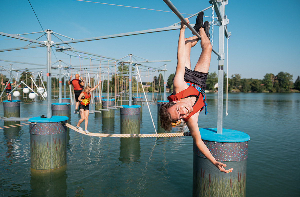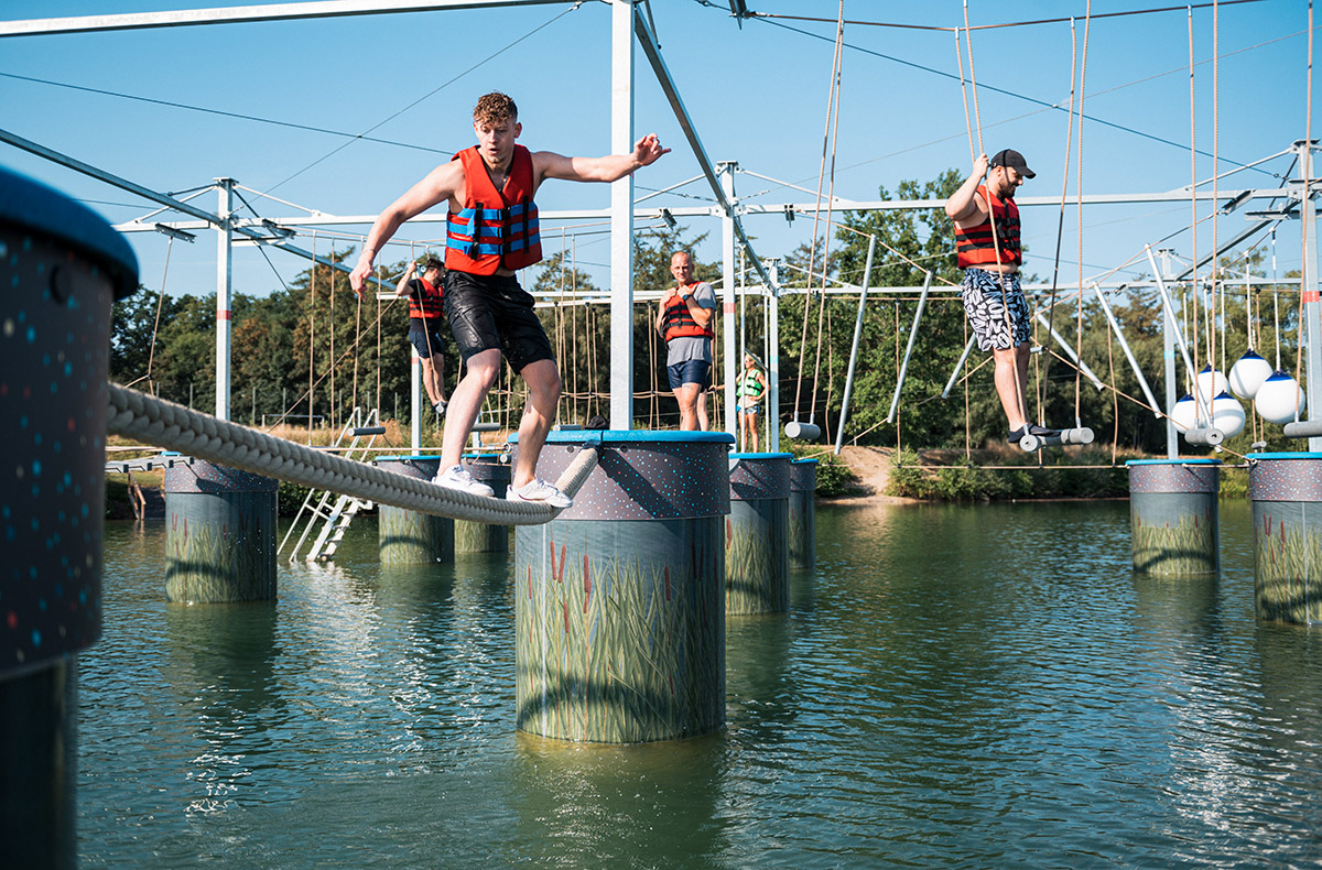 Der Einstieg erfolgt mit einem erfrischenden Schwimmen zum Parcour. Lasst Euch von der beeindruckenden Höhe von bis zu 7,40 Metern begeistern und genießt den Ausblick über das glitzernde Wasser des Sees. Erlebt gemeinsam eindrucksvolle Momente und sammelt unvergleichliche Erinnerungen.