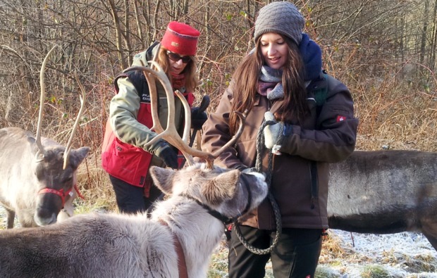 Freundlich werdet Ihr von Eurem Tour-Guide bei Eurer Ankunft im Rentierwald begrüßt. In freudiger Erwartung geht es in das Lappland-Lager, wo Euch die Vierbeiner schon erwarten. Da Eure Tour-Guides selbst familiäre Verknüpfung und ihren Wohnsitz in Lappland haben, erhaltet Ihr eine Einweisung in die samische Rentierhaltung, sowie das Führen und Einschirren der Tiere nach Art der letzten Rentiernomaden im Norden Europas.
