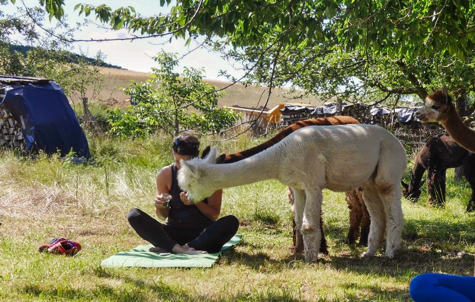 Erfahre die ultimative Entspannung in Elas kleiner Farm in Arnstein. Katja ist Deine Yoga-Lehrerin. Sie begleitet Dich bei Deiner Meditation. Erfreue Dich an der guten Laune der süßen Alpakas. Sie sind den ganzen Tag an Deiner Seite. Die positive Energie der Tiere springt direkt auf Dich über. Innere Ruhe und Kraft macht sich in Dir breit. Du nimmst Deine Umgebung viel intensiver wahr. Eine leichte Brise streift an Dir vorbei. Dein Brustkorb bewegt sich auf und ab. Die kleinen Kamele tappen leise um Dich herum.