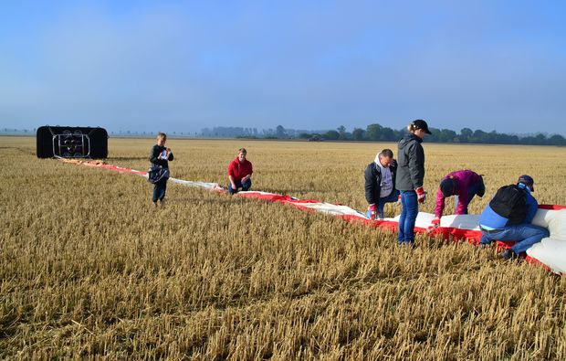 Der Ablauf einer Ballonfahrt beginnt mit dem Auslegen der Hülle und dem Zusammenbau des Korbes mit Zubehör. Sobald die Hülle mit heißer Luft gefüllt wurde und sich zu ihrer vollen Größe emporhebt, steigst Du in den Ballon ein.