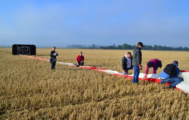 Neigt sich die Ballonfahrt dem Ende zu, sucht sich der Pilot den passenden Landeplatz und leitet die Landung ein. Sobald alle wieder am Boden sind, werden der Ballon sowie die Technik gemeinsam verstaut.