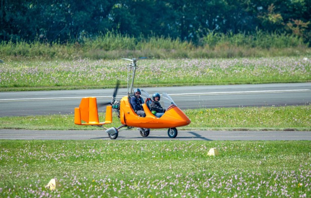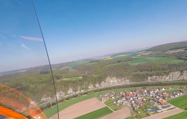 Du hörst wie die Rotorblätter über Dir anfangen sich zu drehen. Deine Vorfreude wird immer größer, während Du den Wind der Propeller auf Deiner Haut spürst. Der Pilot gibt Gas und Ihr fahrt über die Startbahn. Dann ist es so weit. Meter für Meter steigt der Tragschrauber in die Luft. Die Landschaft und die Fachwerkhäuser unter Dir werden immer kleiner und vor Dir breitet sich der Horizont aus. Du erlebst die einzigartige Aussicht über idyllische Landschaft aus der Vogelperspektive. Rechts und links neben Dir nichts als ein unendlich weiter Himmel.
