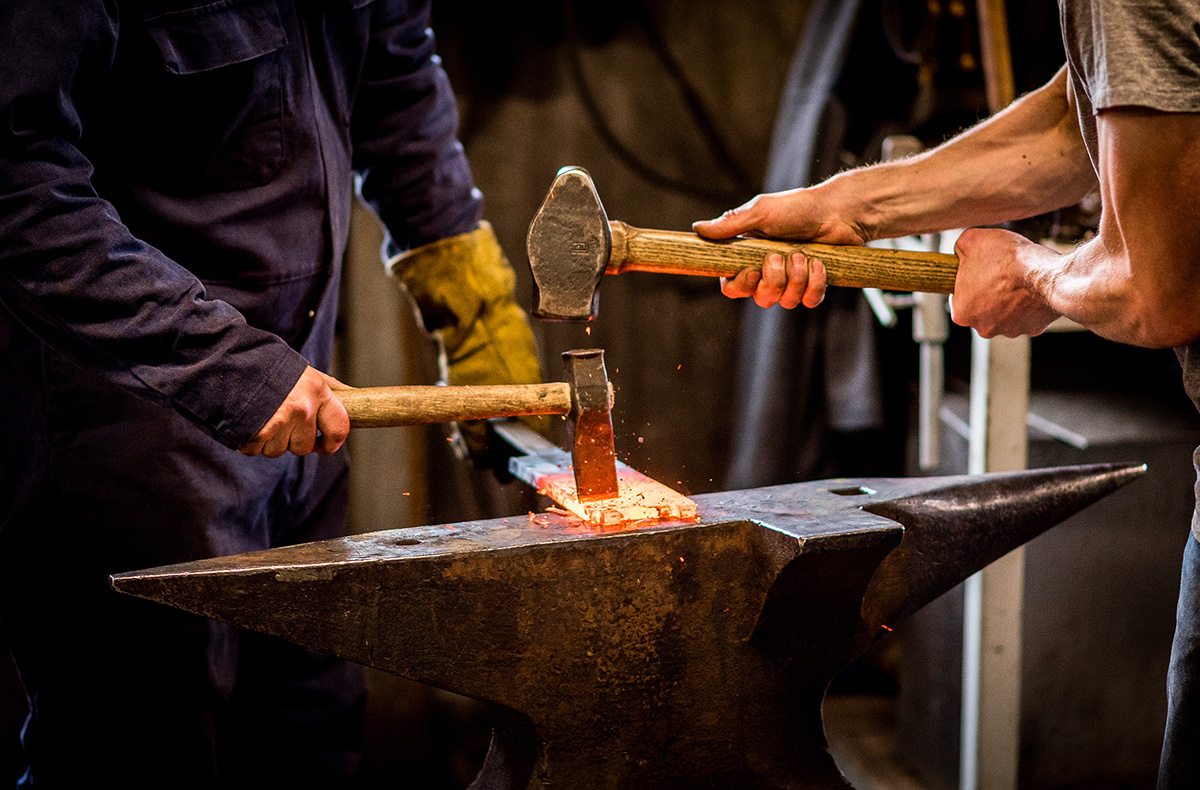 - Arbeit mit Zangen, Vorschlaghammer, Feilen, Raspeln, Schmiedefeuer
