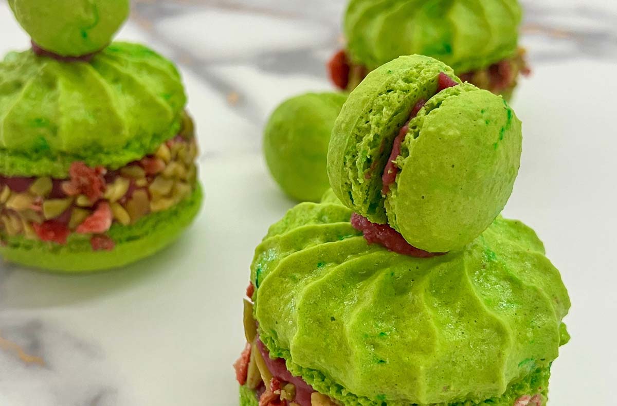 • Zubereitung von Crème brûlée Macarons, Pistazien Macarons, Karamell-Mango Macarons, Schoko-Himbeer Macarons (Frühjahr/Herbst) und Schokoladen-Spekulatius Macarons, Sauerkirsch Macarons, Zimt-Karamell Macarons und Vanille Macarons (November/Dezember)