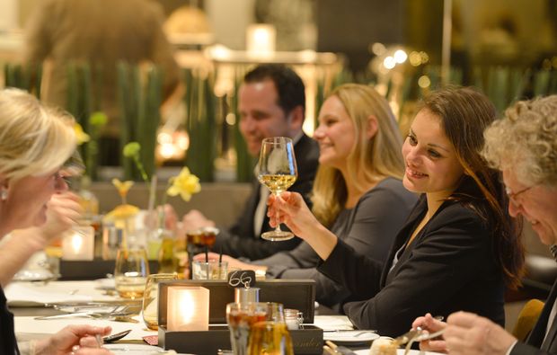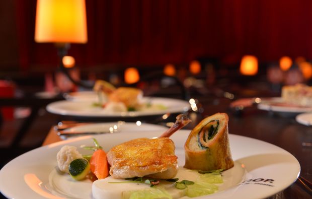 Doch natürlich ist die sensationelle Show nicht alles, was Dich im GOP Varieté-Theater Münster erwartet: Auch das stilvolle Ambiente des Theatersaals mit atmosphärischer Beleuchtung macht das Gesamterlebnis aus. Zudem wird das Abendprogramm von einem 3-Gänge-Menü umrahmt, das wohl auch den anspruchsvollsten Gaumen beglücken wird. Die Köche sind ebensolche Künstler in der Küche wie die Artisten auf der Bühne und zaubern ihre Kreationen mit frischen Zutaten und viel Liebe zum Detail. Vorspeise und Hauptgang genießt Du vor dem ersten Teil des Bühnenprogramms, das Dessert lässt Du Dir dann in der Spielpause vor dem Show-Höhepunkt schmecken.