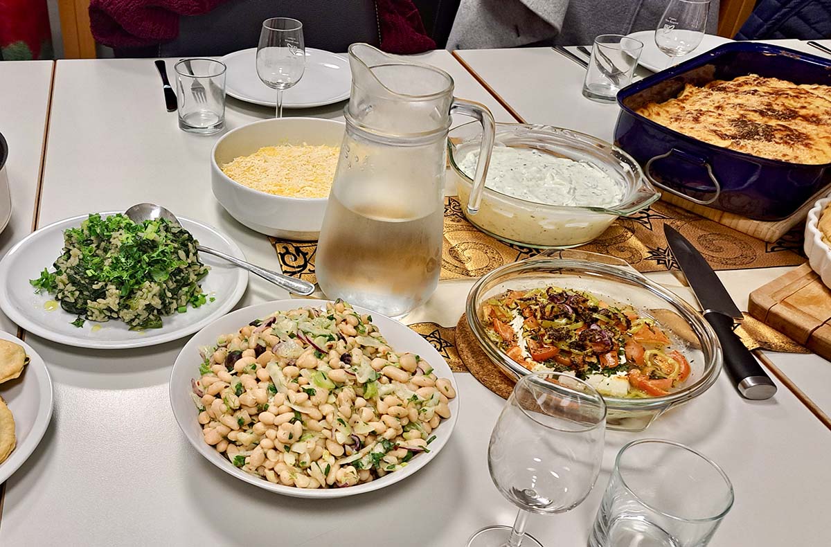 Zubereitung von Falafel mit Hummus, Orientalische glasierte Karotten mit Joghurtcreme, Dolmadakia (gefüllte Weinblätter mit Reis und Kräutern), Gemüse-Tajine mit Harissa und Couscous, Zarte Zucchini mit Harissa und Zitrone, Babaganoush