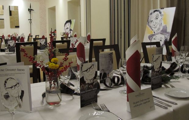 Bei Deinem Heinz Erhardt Abend erwartet Dich zunächst ein Begrüßungsgetränk, bei dem Du Dich in stimmungsvollem Ambiente auf die nächsten vier Stunden einstimmen kannst. Nippe an Deinem Glas und freue Dich auf einen Abend voller Genuss und Erinnerungen an einen großartigen Künstler. Genieße dabei ein feines 3-Gänge-Menü und erfreue Dich an einem außergewöhnlichen Unterhaltungsprogramm, das diesen Abend mit Sicherheit zu einem unvergesslichen Erlebnis macht. Lehne Dich entspannt auf Deinem Stuhl zurück und genieße die amüsante Unterhaltungsshow in Kombination mit einem leckeren 3-Gänge-Menü, das Deinen Gaumen zum Staunen bringen wird.