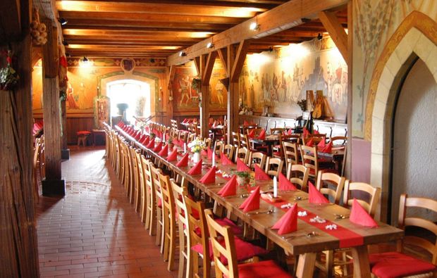 Du bist ein heimlicher Fan des Mittelalters und wolltest schon immer einmal selbst den Ritter spielen? Dann solltest Du Dir das außergewöhnliche Ritteressen mit höfischer Tafeley in Brodenbach auf keinen Fall entgehen lassen. Tauche in die eigentümlichen Gebräuche früherer Zeiten ein und genieße ein zünftiges und deftiges Mahl der etwas anderen Art. Das Ritteressen ist eine einzigartige Kombination aus amüsantem Schauspiel und kulinarischen Köstlichkeiten der Extraklasse.