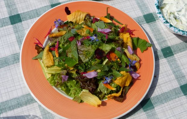 Auf dem gemeinsamen Zwischenstopp auf einer Alm erhältst Du eine fachkundige Führung durch die heimische Kräuterwelt. Hier erfährst Du von einer Sennerin und Kräuterpädagogin viel über die nützlichen Wildkräuter auf der Almwiese. Einige davon werden anschließend bei einer leckeren Speise auf den Tellern wieder zu finden sein, denn die Hüttenwirtin, die mit Leib und Seele kocht, weiht Dich in ihre Kochgeheimnisse ein.
