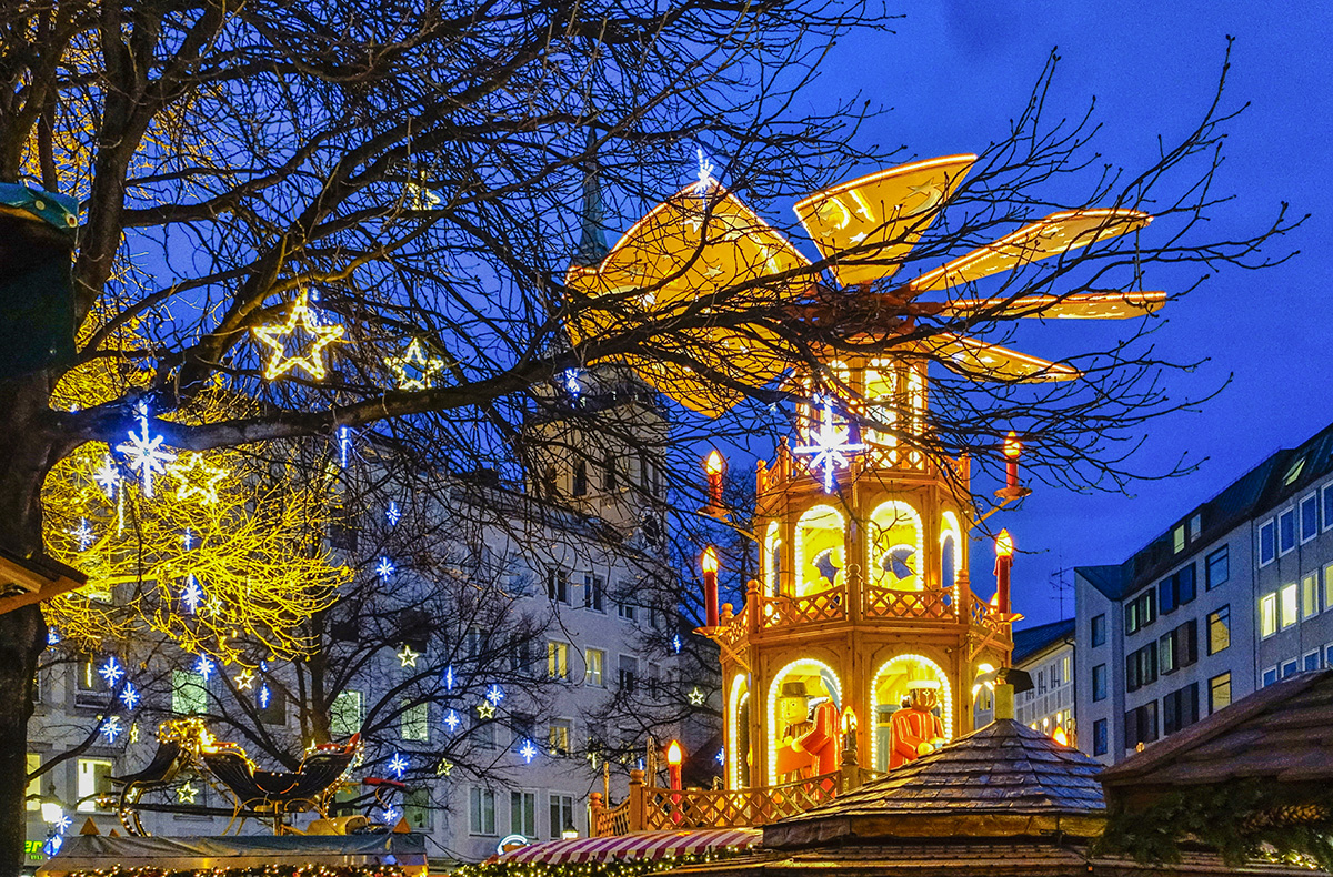 • Probiere dich durch Münchner Köstlichkeiten auf dem Weihnachtsmarkt, z.B. Glühwein, Münchner Bier, gebrannte Nüsse, Feuerzangenbowle, Kartoffelpuffer