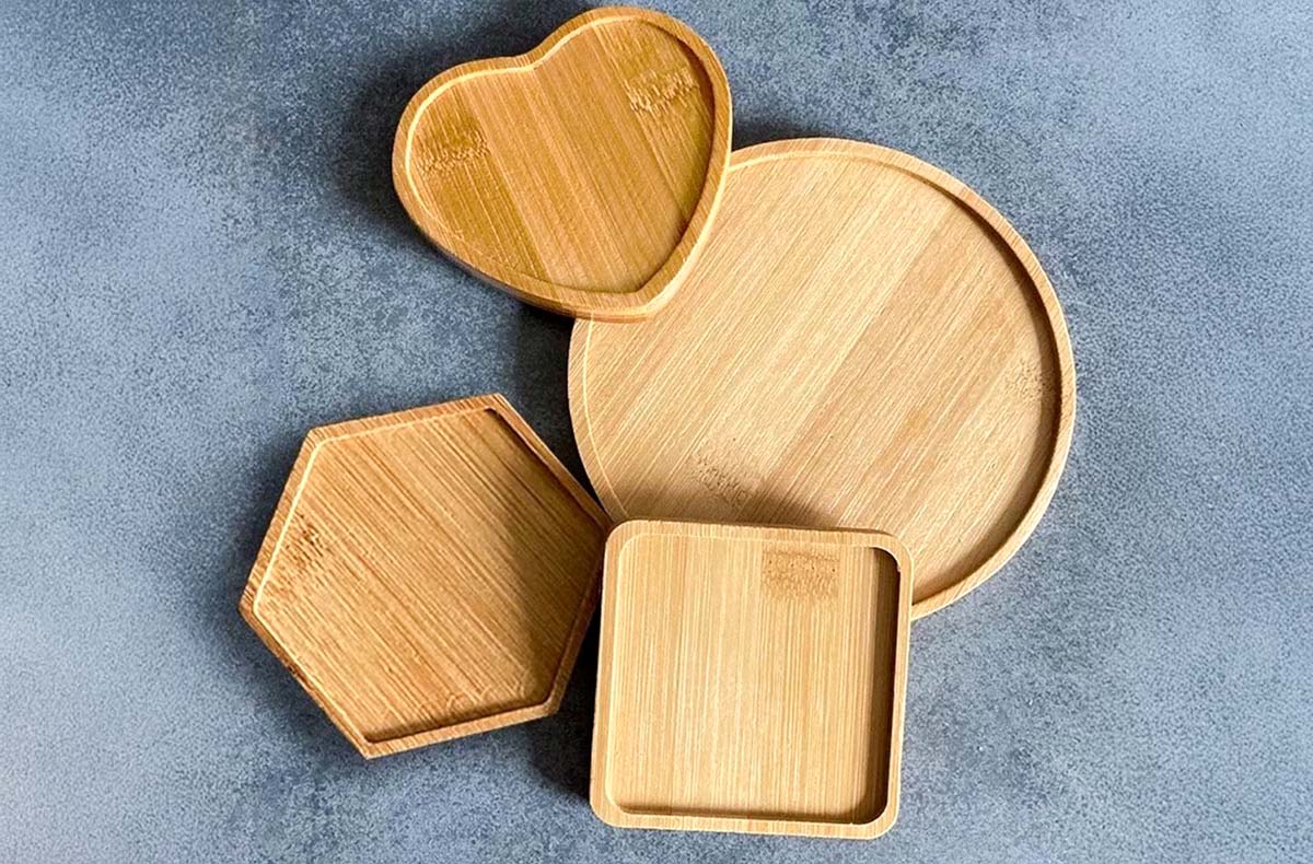 • Große Auswahl an Mosaiksteinchen, verschiedene Formen an Holzuntersetzern und verschiedene Größen an Tabletts