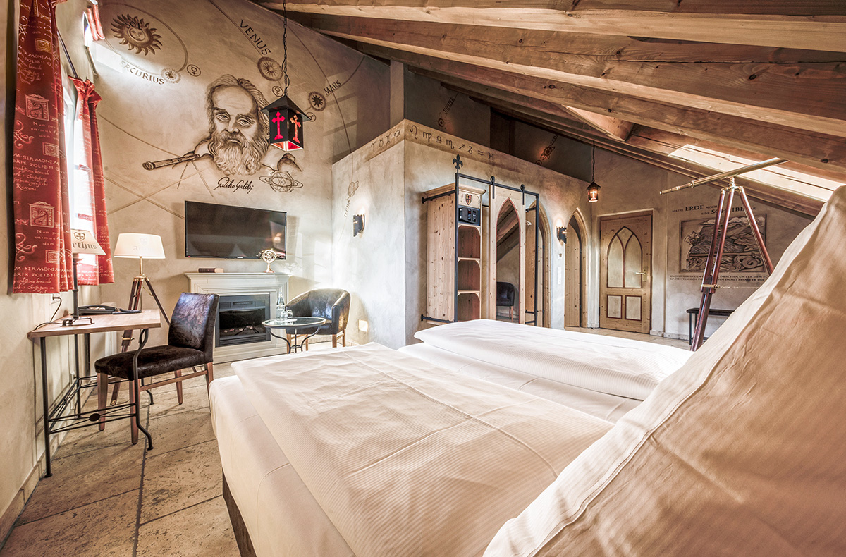 Taucht ein in eine Welt, in der die Zeit stillsteht. Ihr übernachtet in einem der einzigartigen mittelalterlichen Themen-Doppelzimmer mit modernstem Komfort.