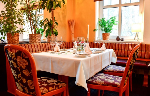 Zur Stärkung wirst Du am Abend mit einem delikaten 4-Gänge-Schlemmer-Menü verwöhnt. Dazu gibt es eine Flasche Pikkolo für Dich und Deinen Liebsten. Genieße einen feinen Gaumenschmaus und lass Dich von den Spezialitäten des Restaurants verzaubern.