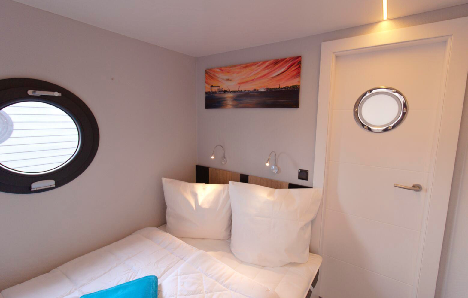 Der offene Grundriss zieht sich über gemütliche 50 Quadratmeter, die Euch alles bieten, was Ihr für behagliche Tage auf See braucht: Bodentiefe Fensterfronten für beste Aussicht bei jedem Wetter, eine vollausgestattete Küchenzeile mit hübschem Essplatz, eine kuschelige Loungeecke, Fußbodenheizung und ein separates Schlafzimmer. Gleich zwei Sonnenterrassen, davon eine auf dem Dach, laden zu trauten Abenden zu zweit bei Sonnenuntergang ein. In der Sauna könnt Ihr Euch derweil bei Schwitzkuren von der Salzwasserluft und der Küstenbrise erholen.