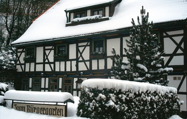 Euer Kurzurlaub beginnt mit einem leckeren Begrüßungsgetränk im Hotel zum Bürgergarten. Das historische Fachwerkhaus liegt in der mittelalterlichen Stadt Stolberg und bietet Euch Ruhe und Entspannung bei bestem Service und Harzer Gastfreundschaft. In dem gemütlichen Doppelzimmer könnt Ihr es Euch bequem machen und am nächsten Morgen mit einem üppigen Frühstück in den Tag starten.