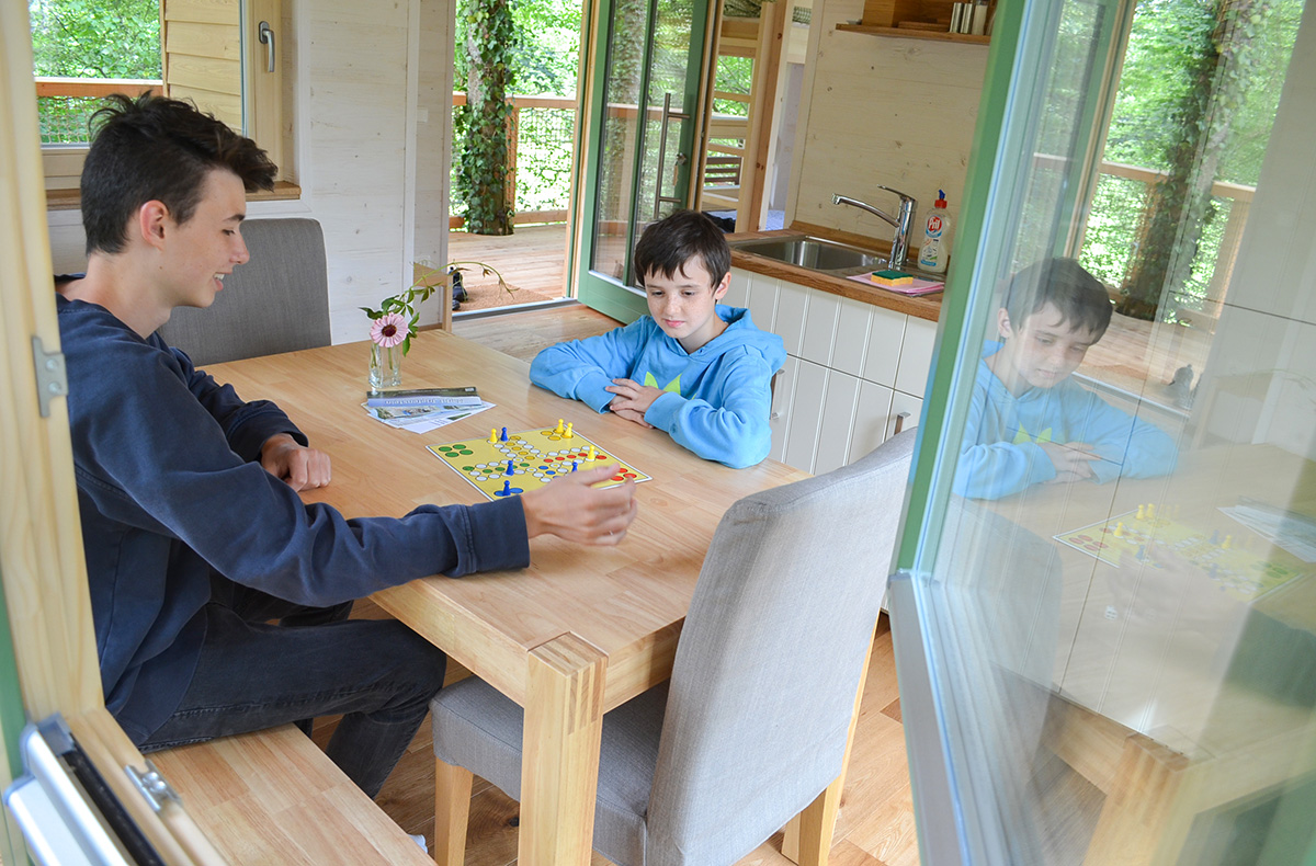 Von der kleinen Kochnische mit Küchentisch, Dusche und WC über die gemütliche Sitzecke mit Fernseher bis hin zu Handtüchern, Bettwäsche und Fön wird es Euch hier an nichts mangeln. Die vorhandene Infrarot Heizung ermöglicht das ganze Jahr über kuschelige Stunden zu Zweit. Besonderes Highlight ist die großzügige Terrasse. Hier könnt Ihr die Abende bei einem leckeren Glas Wein verbringen, Vögeln beim Zwitschern und Grillen beim Zirpen zuhören und Euch ganz auf die Natur konzentrieren – eine unglaubliche Atmosphäre. Morgens um 8:00 Uhr wird Euch Euer Frühstück direkt ans Baumhaus geliefert.
