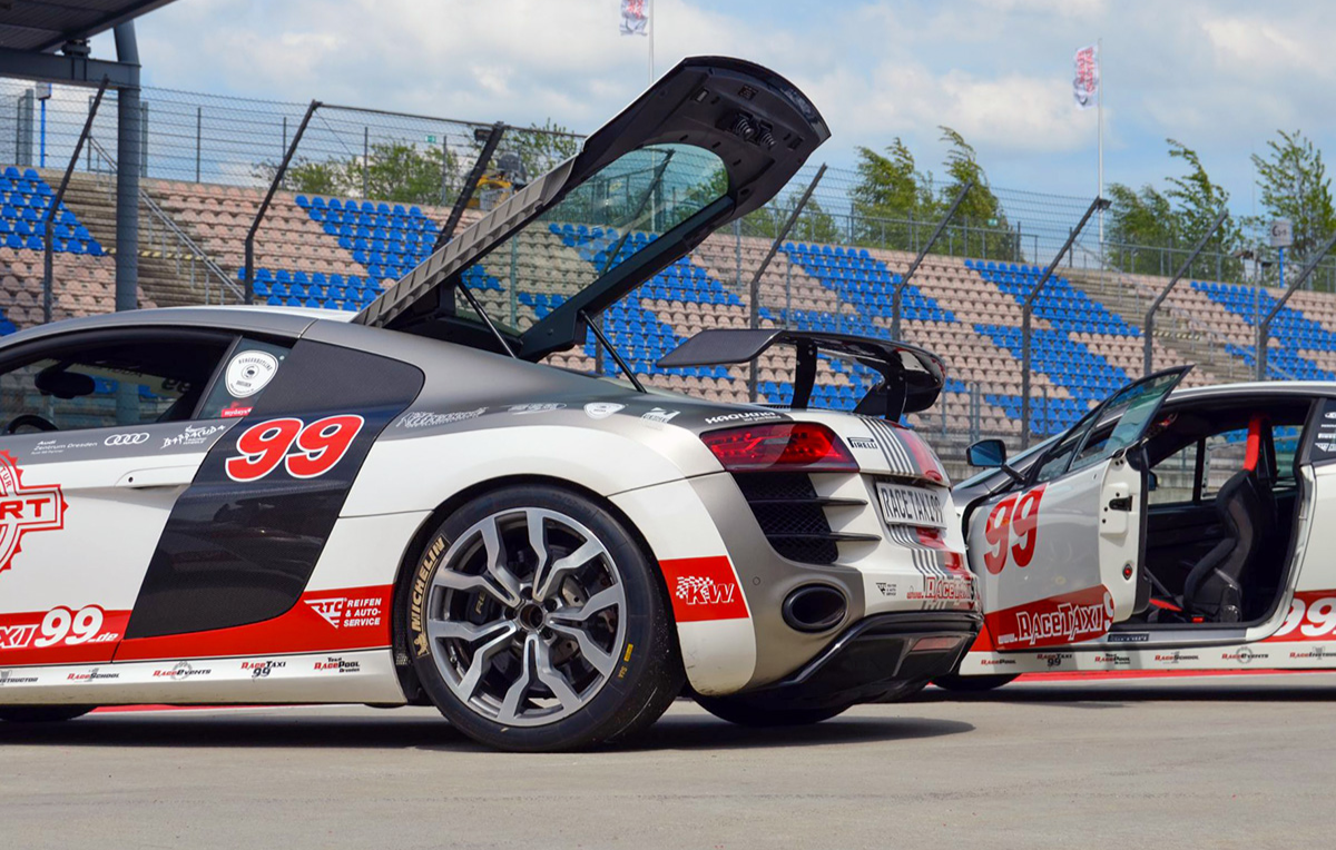 • In einem der 3 Sportwagen 2 schnelle Taxi Runden mit dem Profi