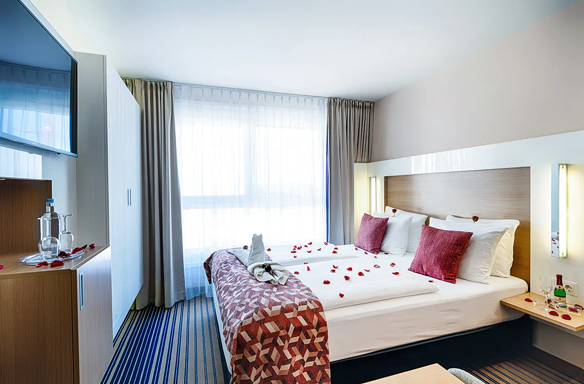 Freut Euch auf eine Nacht im komfortablen Doppelzimmer mit romantischer Tischdekoration. Startet den Tag mit einem reichhaltigen Frühstücksbuffet, das durch täglich wechselnde Themenecken immer wieder neu überrascht.