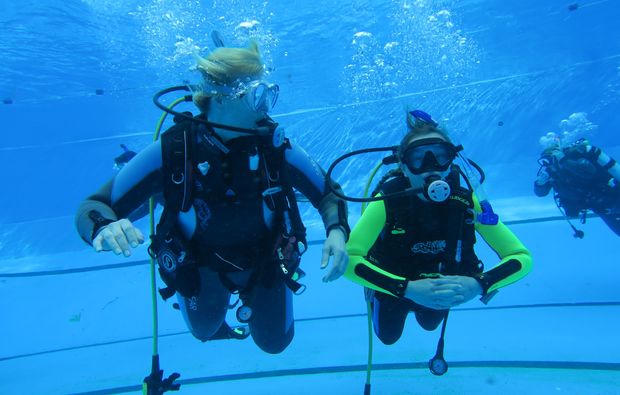 Du tauchst in einem Pool. Je nach Jahreszeit im Hallenbad oder im Freibad.