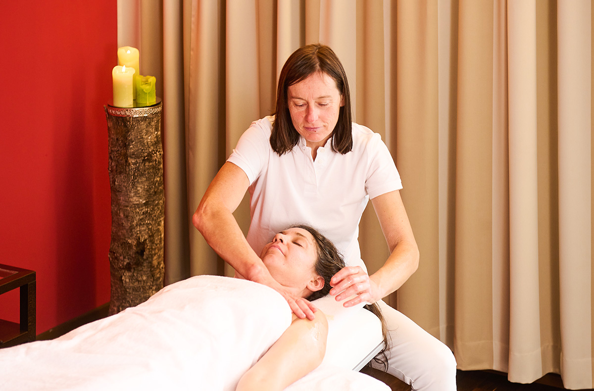 Während der Massage liegt ein besonderer Fokus auf dem Schulter- und Nackenbereich, wo angenehme Dehnungen und Mobilisationen Verspannungen lösen. Die Bewegungen entlang des Rückens bis zur Lendenwirbelsäule vermitteln ein Gefühl der Schwerelosigkeit.